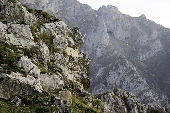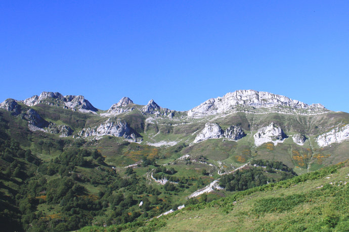 Esta roca caliza estratificada, fracturada y desgastada es la nota predominante del terreno alto, dejando paso a las depresiones pizarrosas bajas cubiertas de masa vegetal.